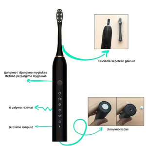 Elektrinis dantų šepetėlis su papildomomis 4 keičiamomis galvutėmis – USB įkrovimas, 6 valymo režimai