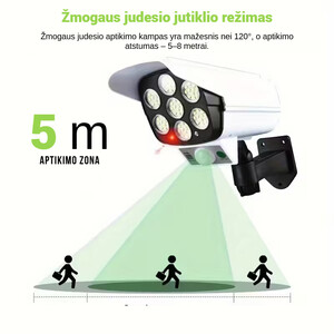 Integruotas saulės baterijos modulis kaupia energiją dienos metu, o sutemus šviestuvas automatiškai įsijungia. Jutiklis reaguoja į žmogaus judesį 5–8 metrų atstumu, todėl apšvietimas įsijungia tik tada, kai to reikia – taupoma energija ir užtikrinamas saugumas.