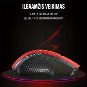 Pelė veikia baterijomis, todėl nereikia jokių laidų ar įkrovimo — tiesiog įdedate baterijas ir naudojate.