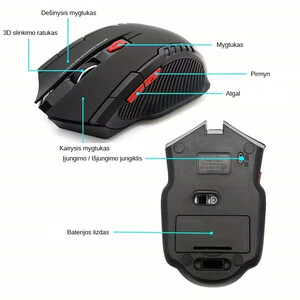 Ryšys 2.4G USB Įkrovimas Nepalaikomas Baterija 2 × AAA baterijos Judesio technologija Optinė Galia 0.1–1.15W Įtampa ≤36V Medžiaga Patvarus plastikas Spalva Juoda