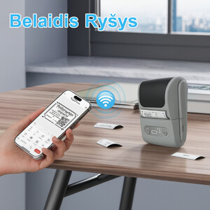 TECHNINĖS SPECIFIKACIJOSRyšys Bluetooth (Android / iOS) Spausdinimo tipas Termininis (be rašalo, be tonerio) Spausdinimo plotis 20–50 mm Maitinimas Integruota ličio baterija (USB-C įkrovimas) Pritaikymas Etiketės, QR kodai, kainos, brūkšniniai kodai, organizavimas Suderinamumas Android, iOS