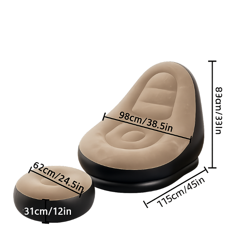 Atsipalaiduokite bet kur – namuose, sode, balkone, kelionėse ar gamtoje – su šia ergonomiška pripučiama sofa–kėde ir pakojėliu. Dėl patogios formos, minkšto veliūrinio viršaus ir tvirto PVC pagrindo ji suteikia išskirtinį komfortą tiek sėdint, tiek gulint.
