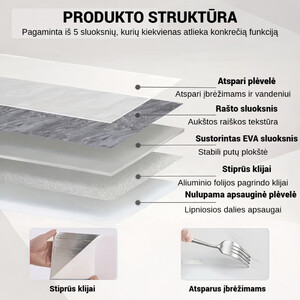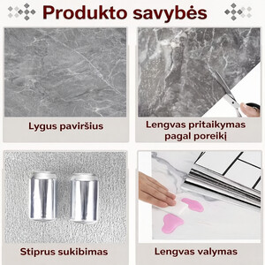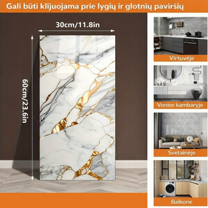 Prabangus dizainasPilkas marmuras su auksiniais akcentais.Atsparūs vandeniuiTinka virtuvei ir voniai.Lengvai karpomiPritaikykite pagal poreikį.Be remonto„Nulupk ir priklijuok“ principas.