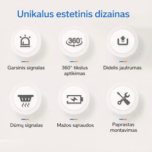 TECHNINĖS SPECIFIKACIJOSJutiklio tipas Fotoelektrinis Aptikimas 360° Garso signalas 85 dB Indikacija LED šviesa Valdymas TEST / Nutildymo mygtukas Paskirtis Vidaus patalpoms (namai, biuras, nuoma)