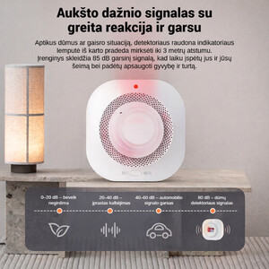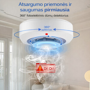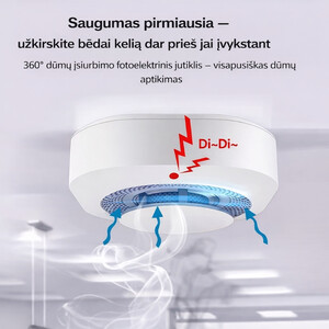 Ankstyvas aptikimasFotoelektrinis jutiklis greitai aptinka dūmus.360° aptikimasReaguoja iš bet kurios krypties.Garsus signalas85 dB aliarmas + LED perspėjimas.Paprastas montavimasGreitai pritvirtinamas be sudėtingų įrankių.