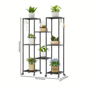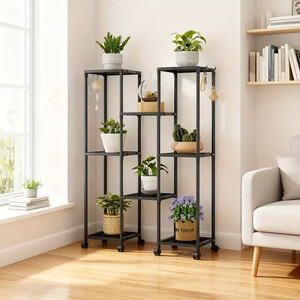 Prekės tipas Augalų stovas Aukštis 97,5 cm Bendras plotis 75 cm Gylis 27 cm Lentynų skaičius 8 lentynos Medžiaga Metalas Spalva Juoda Paviršiaus apdaila Miltelinė danga Konstrukcija Metalinė rėmo konstrukcija Mobilumas Su ratukais