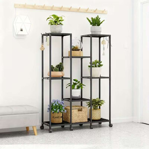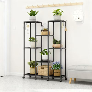 Minimalistinis metalinis augalų stovas – 8 lentynų su ratukais