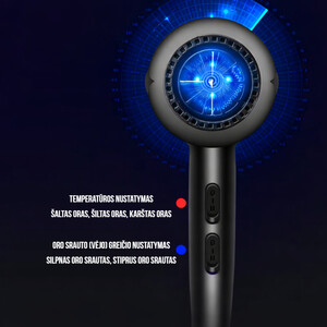 1200 W galiaEfektyvus ir tausojantis džiovinimas.Temperatūros kontrolėŠaltas, šiltas ir karštas oras.Lengvas ir patogusErgonomiškas dizainas kasdienai.Tylus veikimasTinka naudoti namuose.