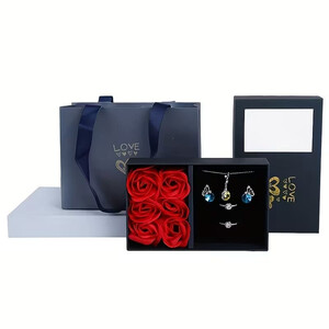 Dovanų dėžutė su 6 dirbtinėmis rožėmis, atviruku ir dovanų maišeliu
