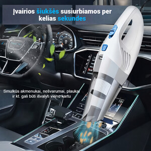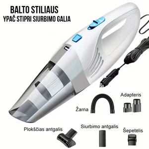 Skirtas automobiliui12V maitinimas per cigarečių degiklį.3 KPa galiaEfektyvus trupinių ir smėlio siurbimas.Daug antgaliųSiauriems plyšiams ir kampams.KompaktiškasLengvas, neužima daug vietos.